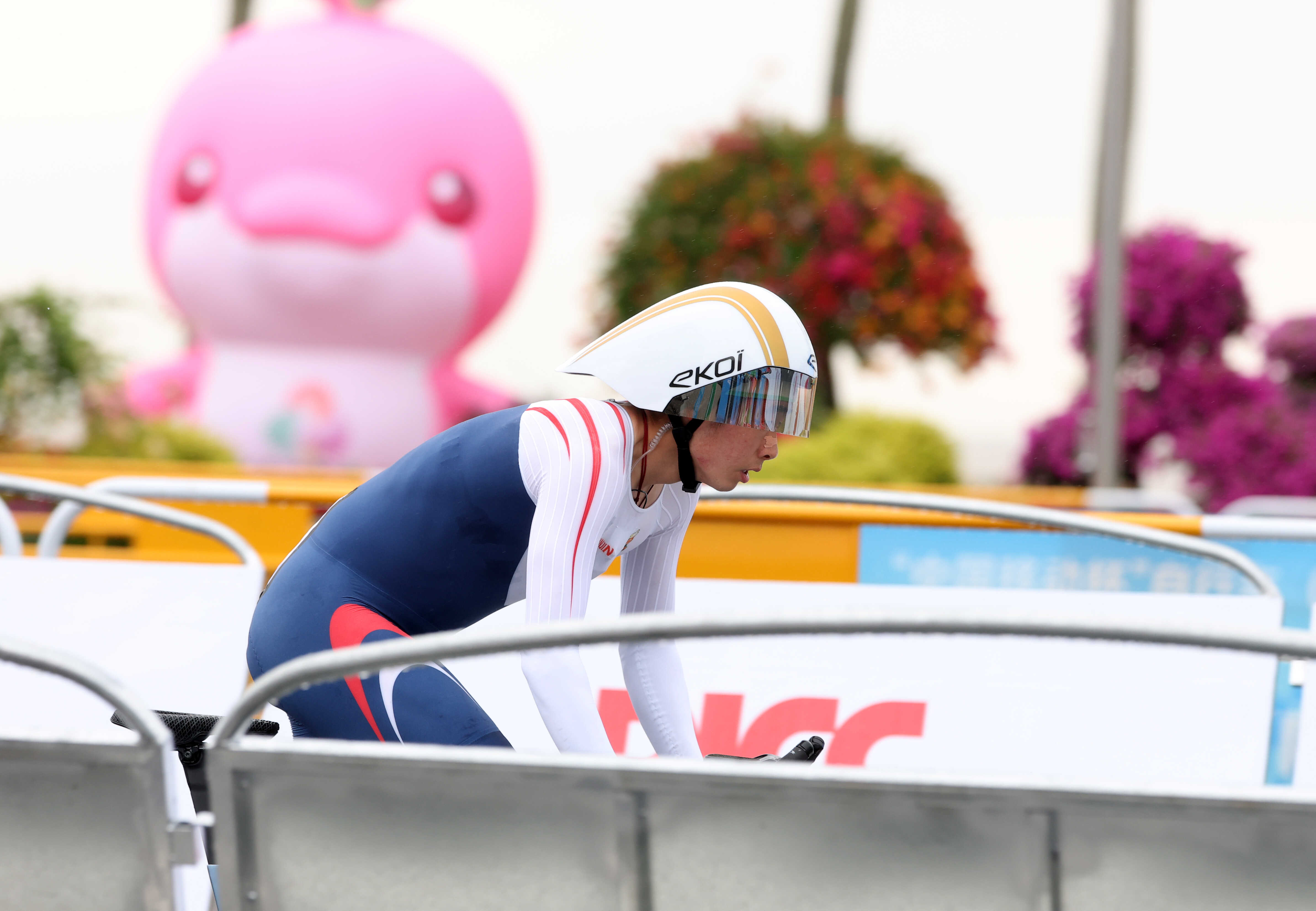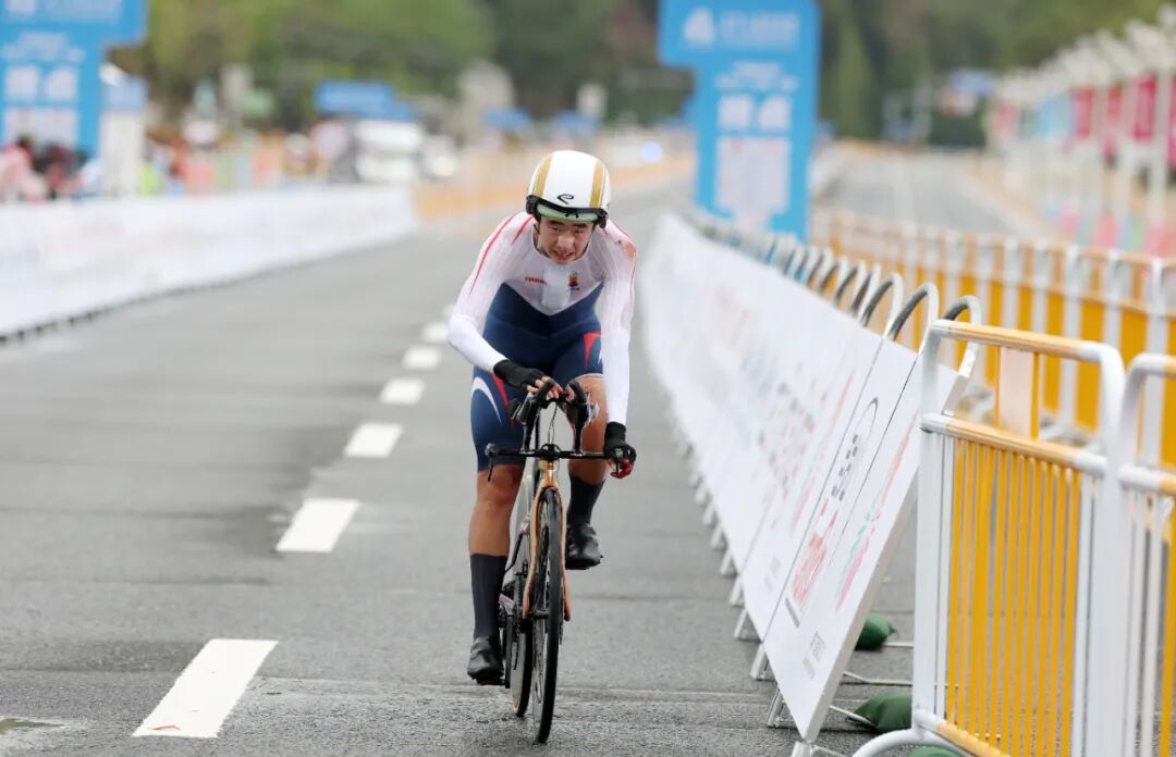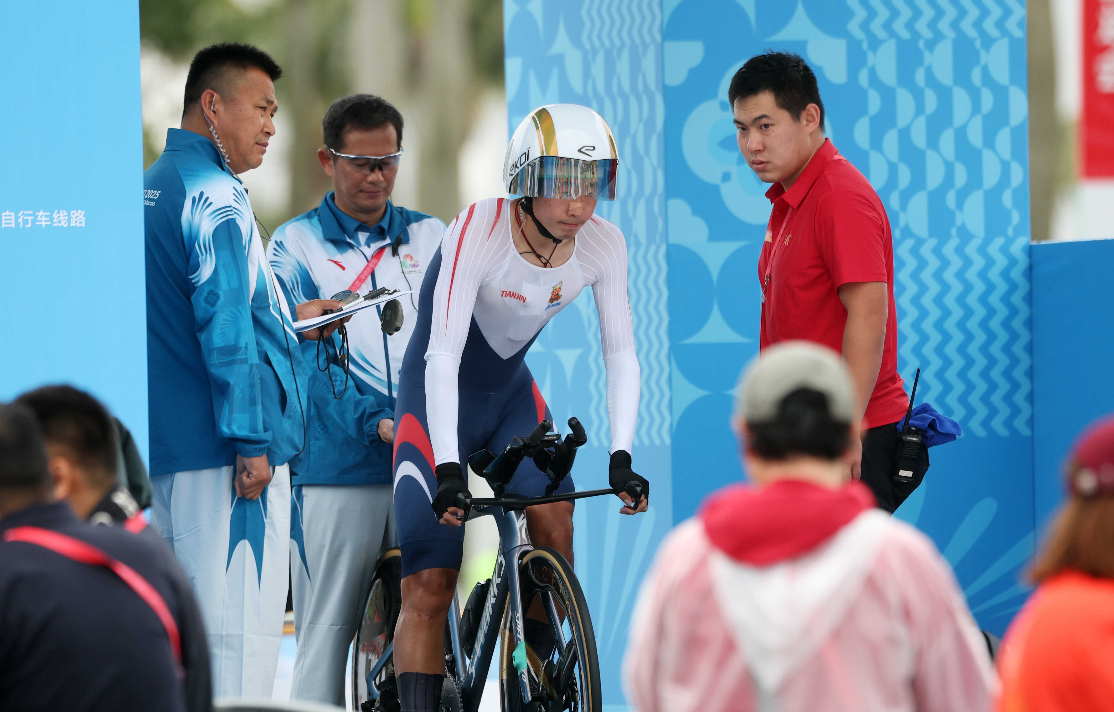 比赛日天公不作美,下起了蒙蒙细雨。公路自行车赛道被雨水冲刷后变得湿滑,比赛21至22公里处成为“重灾区”,十余名选手纷纷在这里出现失误,频频摔车,其中就包括本次赛事的卫冕冠军,来自天津的选手薛铭。“出现(摔车)失误之后我起来继续比赛,教练始终在激励我,说我没问题。但是最后还剩3公里的时候实在拼不下去了,感觉体力透支了,速度慢下来很多,我心里清楚要与金牌失之交臂了。不过我还是想把自己的身体榨干,拼命骑到终点。”