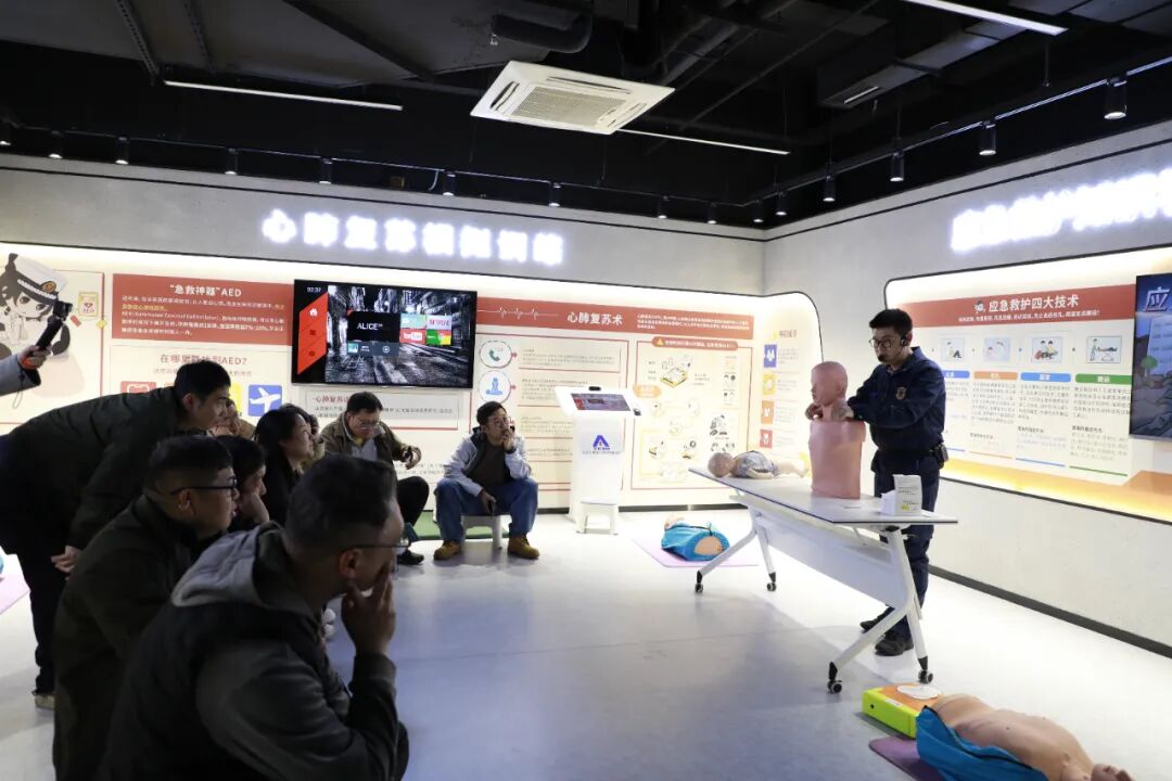 实操演练环节,参训人员分组实战参与模拟烟雾逃生、灭火器操作、消防水带连接、AED应急救援等科目。在专家现场指导下,全体人员严格遵循操作规程,熟练掌握“提、拔、握、压”灭火技巧与“低姿、捂鼻、沿疏散指示”逃生要领。演练中,天津体彩职工、第三方人员与专家实时沟通设施使用细节、应急联动流程,进一步明确“日常巡检— 隐患上报—协同处置”的安全管理闭环机制。