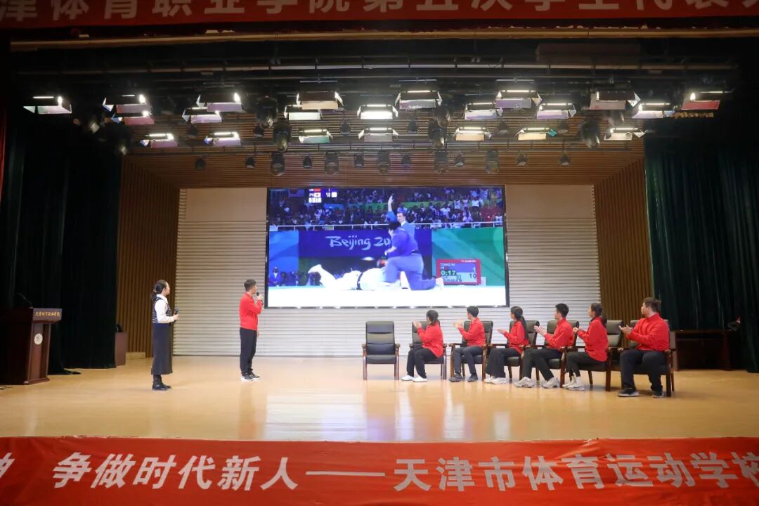 本次活动精心筹备一个月,最终6名优秀学生代表脱颖而出,站上展示舞台。活动现场,这6名来自不同年级、不同运动专项的学生围绕“优秀运动员的榜样故事”依次登台分享,通过讲述天津籍运动员在十五运期间的动人事迹,让现场师生深切感受竞技体育的精神力量。