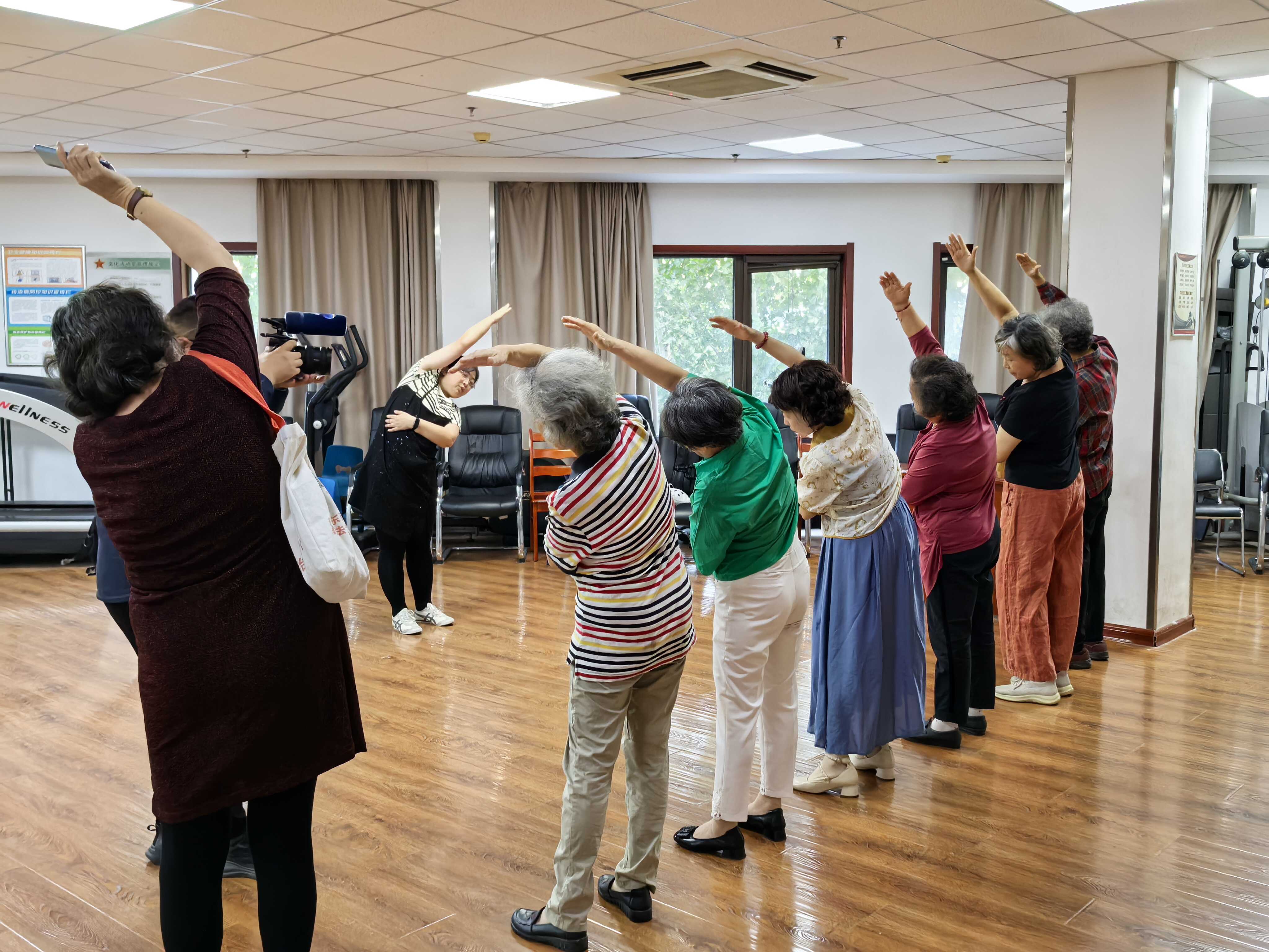 理论讲解后,活动进入备受期待的互动环节。吕老师带领居民进行了专项动态拉伸训练,现场示范了包括肩部环绕、体侧运动在内的多个拉伸动作,并详细讲解每个动作对提升身体灵活性、协调性及预防运动损伤的积极作用。在吕老师的耐心指导和实时纠正下,居民们积极参与,通过亲身实践掌握了科学的热身与放松方法。