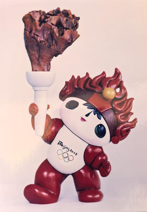 福娃举起“火炬”前面的四块河滩鹅卵石,天然显现“二OO八”,这是举办北京奥运会的年代。