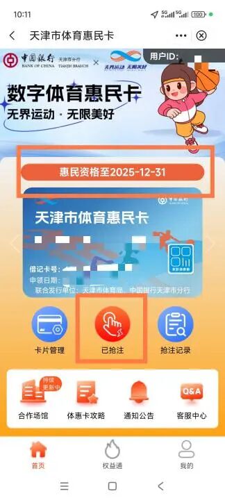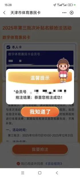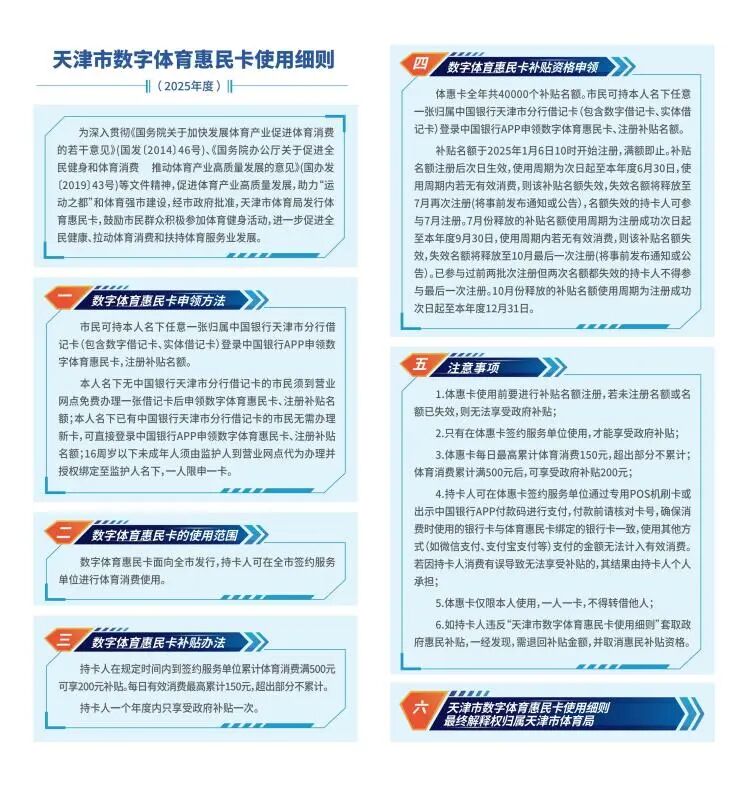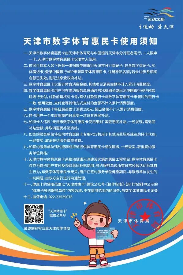5、“天津市数字体育惠民卡”是由天津市体育局推出的数字化体育福利卡,旨在鼓励市民积极参与体育锻炼,享受体育消费优惠,让运动更便捷、更实惠。