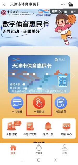 您可于抢注成功次日(在名额有效期内)前往由天津市体育局官方认证的 “体惠卡”签约服务单位进行体育消费(签约单位覆盖我市16个行政区,涵盖近50种体育项目)。
