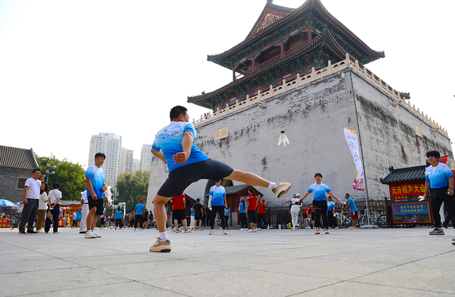 开幕式后,网式毽球表演赛和五人围踢毽比赛同时打响,二传到位、网前进攻、拦网救球,快速的攻防转换令人目不暇接;花式前打、后打、飞燕、纺车、一字马……“中国功夫”般的高水平技艺吸引了众多市民驻足观看和拍摄。