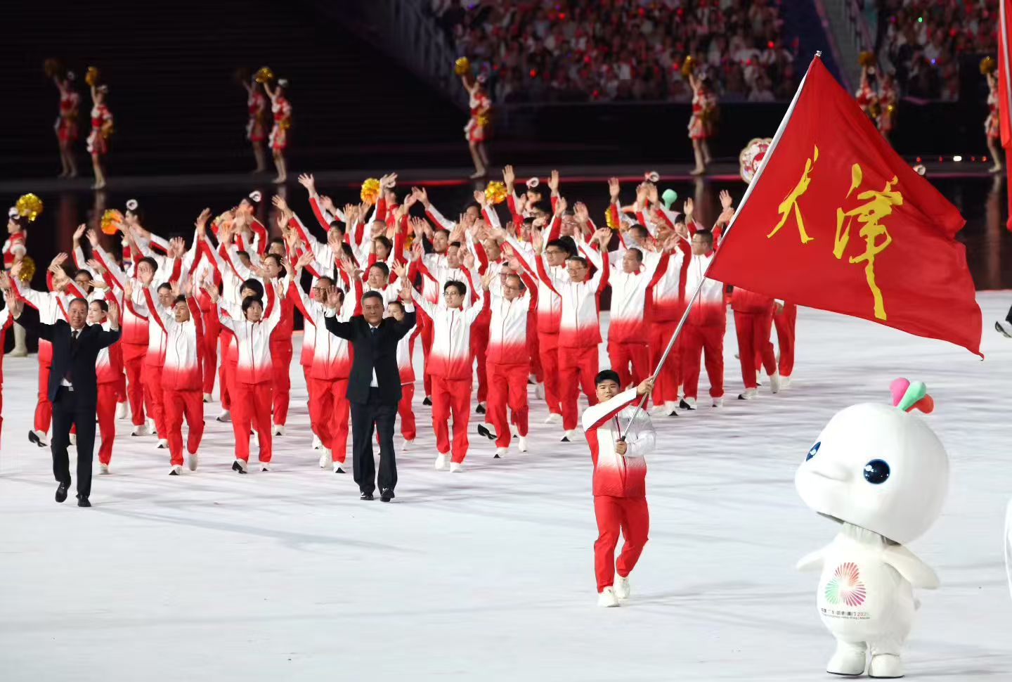 天津代表团由奥运冠军刘焕华担任旗手,代表团成员挥舞双手,步伐整齐,展现了天津健儿的风采。开幕式后,天津运动员将在女排、柔道、举重、游泳等项目上对金牌发起冲击,在大湾区展示天津体育健儿的风采。