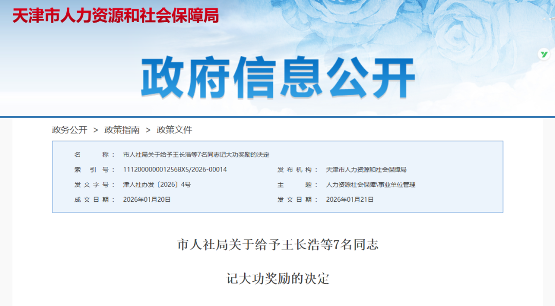 日前,天津市人社局网站发布了《市人社局关于给予王长浩等7名同志记大功奖励的决定》,决定给予王长浩、田斌、赵治山、唐婧、惠欣冉、陶昱颖、刘焕华7名同志记大功奖励。