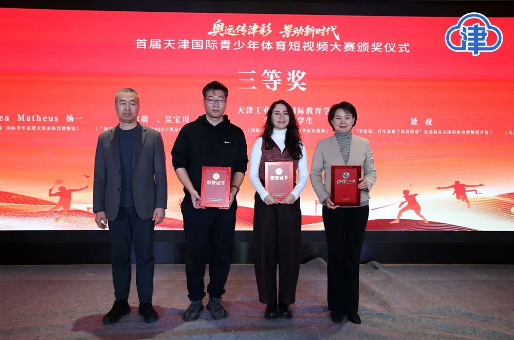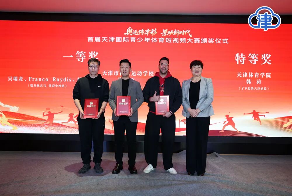 天津市体育局副局长、党组成员吴卫凤向南开大学国际青年吴瑞龙、刘氏云、那迪和天津外国语大学委内瑞拉青年苏小安颁发“天津体育文化国际推荐官”证书,希望他们通过自己的亲身参与和独特视角,向世界推介天津体育文化的独特魅力。本次大赛一等奖获得者、委内瑞拉青年吴瑞龙表示,他深爱中国文化,在天津生活的8年是他人生中最难忘的时光。每年他都要参加天津马拉松半程比赛,每年都会刷新自己的新纪录,体育运动强健了自己的体魄,增强了自己的韧性,体育精神更激励他克服困难,不断向更高目标迈进。未来,他将发挥自己在西班牙语方面的优势,做好中西文化传播的使者,让更多外国朋友来到天津,爱上天津,通过运动和比赛结出友谊之花。