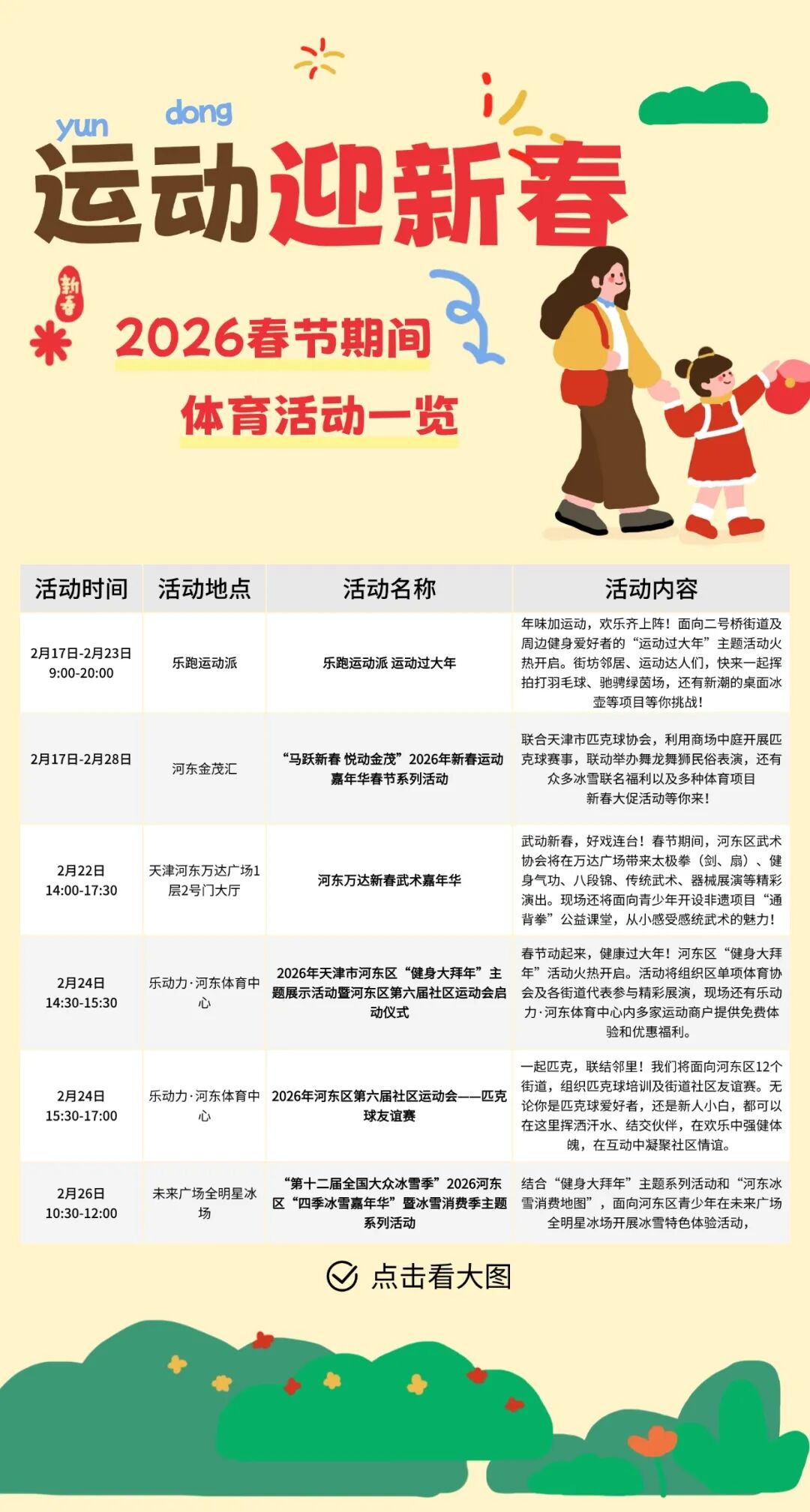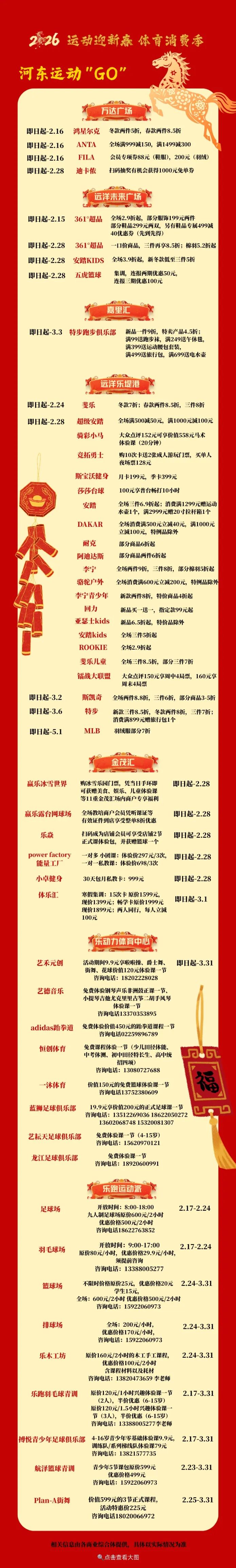 金蛇辞旧,骏马迎春。2026年春节期间,河东区体育局、河东区商务局以“运动迎新春”为主题,整合全区体育赛事活动、冰雪运动资源与惠民年货福利,推出新春体育消费季系列活动。从体育综合体的赛事活动体验到各大商圈的运动福利,将体育消费、冰雪运动与新春年味深度融合,让广大市民朋友在运动中感受新春活力,在新春佳节中共享消费福利。
