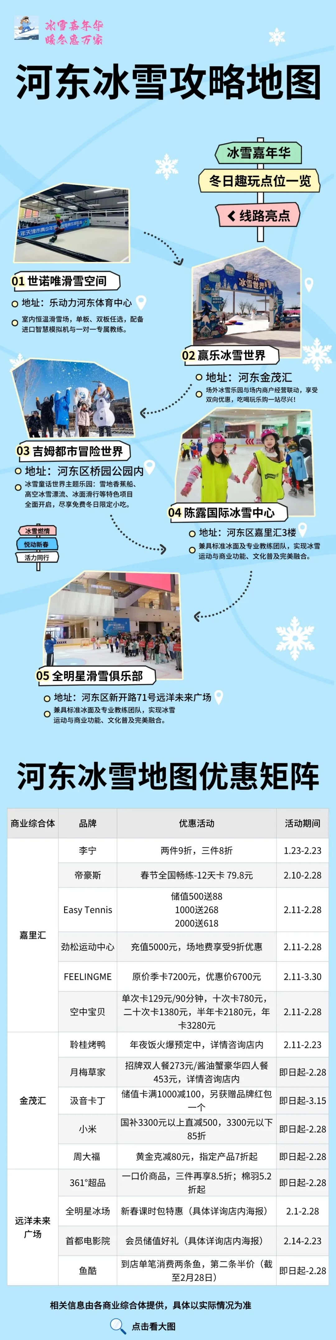 河东区精心绘制“河东冰雪攻略地图”,串联起金茂汇赢乐冰雪世界、世诺唯滑雪运动中心、吉姆都市冒险世界、未来广场全明星滑雪俱乐部、陈露国际冰雪中心等五大海河东岸冰雪地标,形成“多点联动、全域覆盖”的冰雪体验网络。各冰雪场地同步推出公益体验课、亲子互动、赛事展演以及消费联动等活动,让市民在家门口畅享冬日运动乐趣。