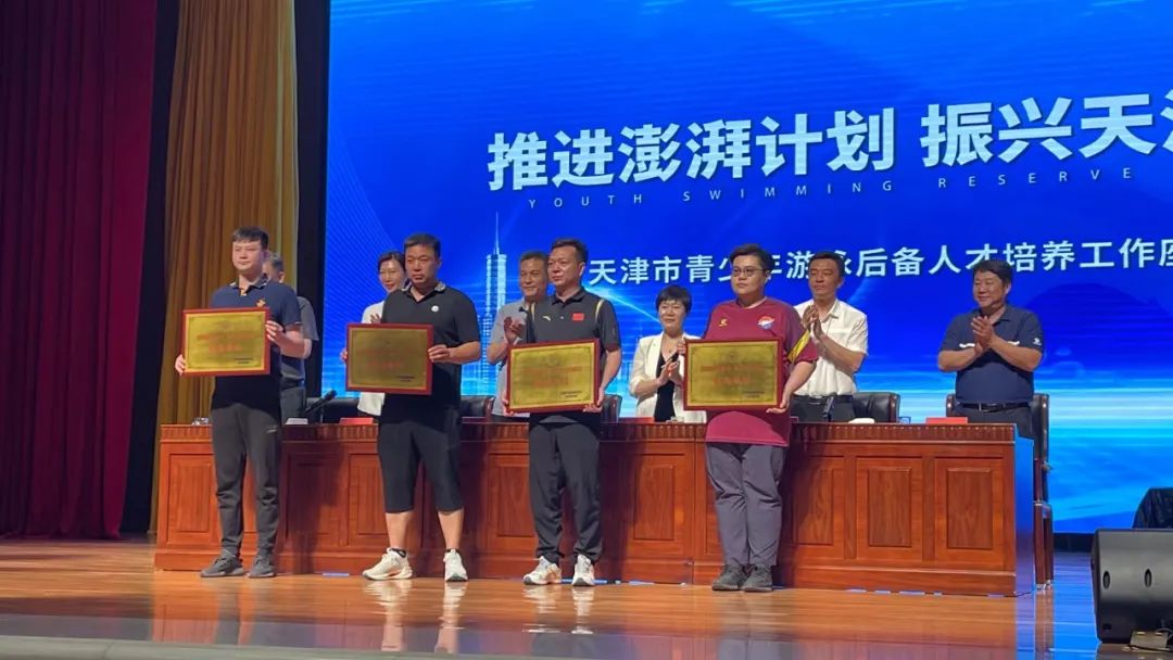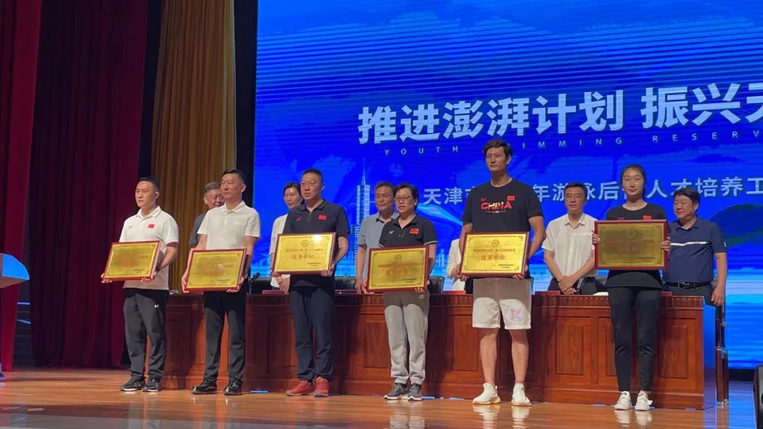 与会人员集体观看了《澎湃天津》宣传片,共同回顾了自2019年初游泳“澎湃计划”启动至今相关比赛、训练营、培训等天津游泳事业发展历程。与会领导向西青泳协、东丽泳协、南开泳协、北辰泳协、和平泳协、滨海泳协、万豪俱乐部、海天健俱乐部、河北全民等10家区级游泳协会和游泳俱乐部进行“推进澎湃计划,振兴天津游泳优秀单位”授牌。